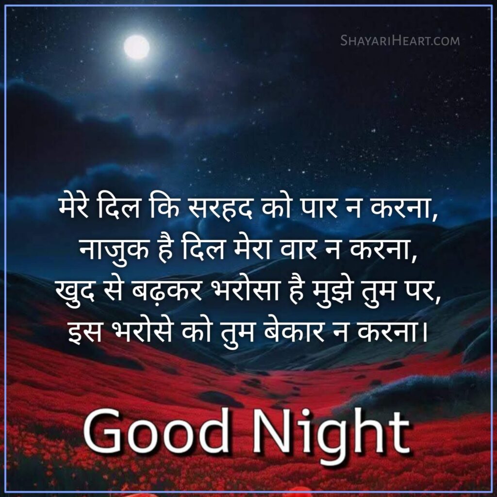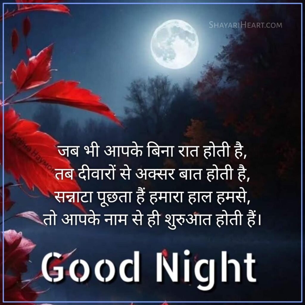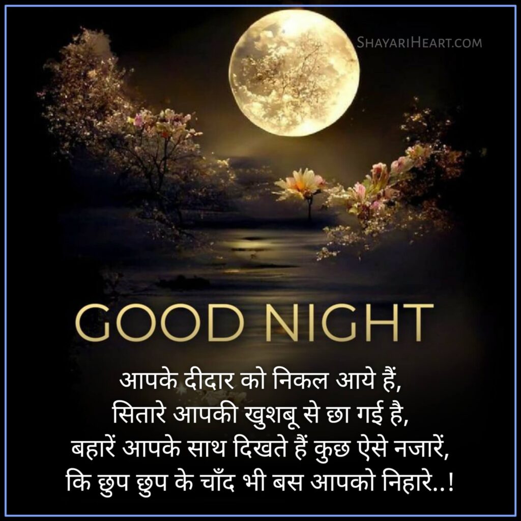 (गुड नाइट शायरियां) जो आप अपने चाहने वालों को भेज सकते हैं। तो चलिए इस रात को अल्फ़ाज़ों की मिठास से और भी खास बनाते हैं, तो पढ़िए इसी तरह की (गुड नाइट शायरि) और खो जाइए सपनो की दुनियां में। और इन शायरियों को आप अपने सोशल मीडिया अकाउंट्स पर भी शेयर कर सकते हैं, Facebook और WhatsApp & Instagram पर शेयर कर सकते हैं।