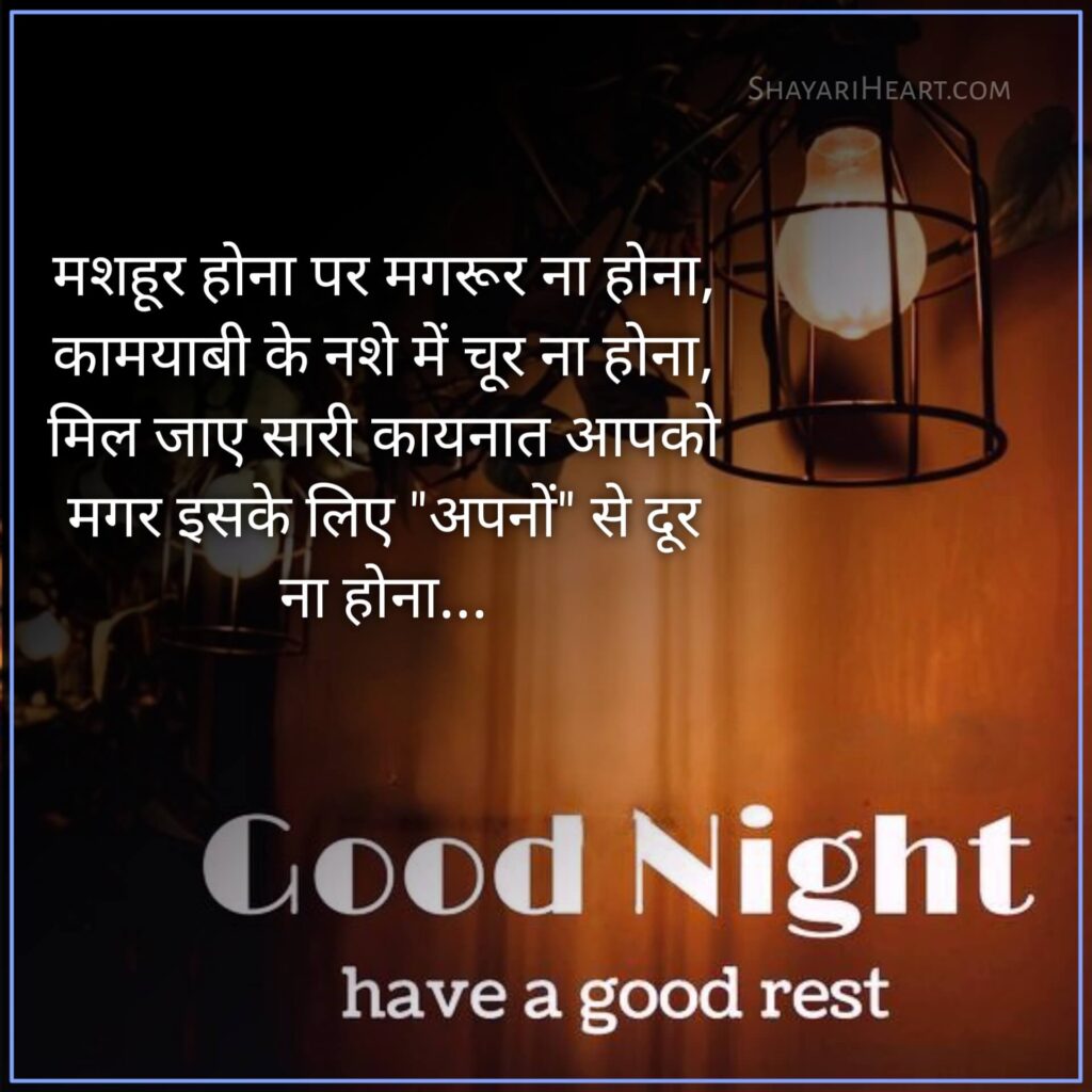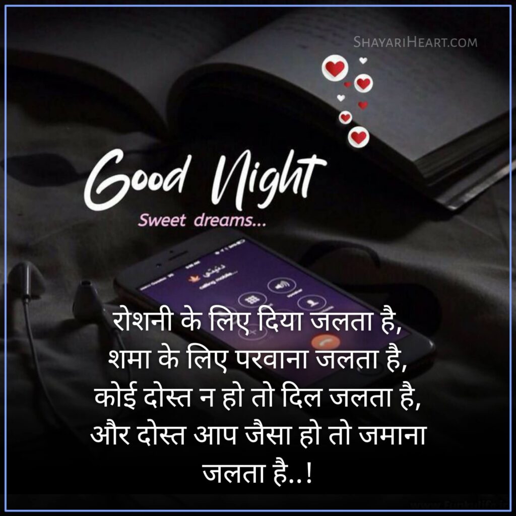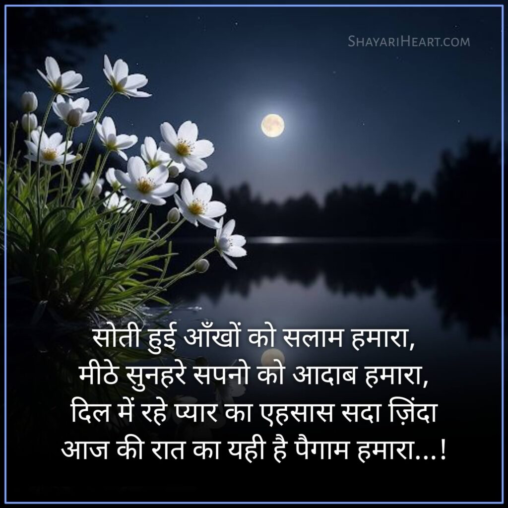 (गुड नाइट शायरियां) जो आप अपने चाहने वालों को भेज सकते हैं। तो चलिए इस रात को अल्फ़ाज़ों की मिठास से और भी खास बनाते हैं, तो पढ़िए इसी तरह की (गुड नाइट शायरि) और खो जाइए सपनो की दुनियां में। और इन शायरियों को आप अपने सोशल मीडिया अकाउंट्स पर भी शेयर कर सकते हैं, Facebook और WhatsApp & Instagram पर शेयर कर सकते हैं।